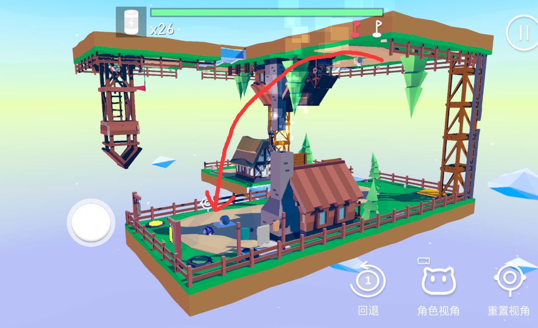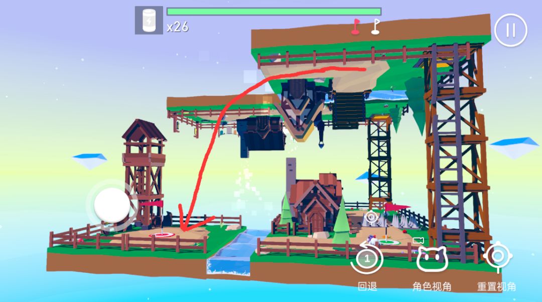 答案是需要从原来的下平面“跳”上去,重叠空间的引力通关机关触发上下面切换,而非重叠部分的空间引力则固定为那部分平面的引力,所以我们需要回到原来的下平面过河的那端过去。