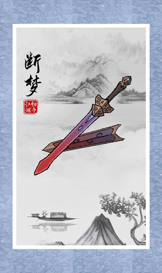 断梦: 峨眉派的传教至宝,断梦断梦,一剑断梦,一剑梦回。此剑是铸剑师辛阳子之作,辛阳子受前几任峨眉掌门之托铸造此剑,辛阳子苦思百日而不得其门,一日行至断梦山,忽梦得有一剑向他斩来,那剑剑光熠熠,红紫相间,剑气纵横天地间。辛阳子梦醒之后,终得铸造法门,耗时半年铸造此剑,辛阳子给剑取名断梦,剑成将此剑交给峨眉派,而此剑也不负断梦之名,令峨眉派在江湖上声名大噪。