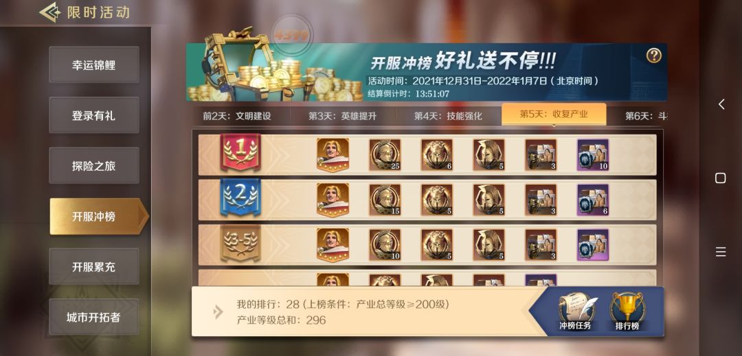 建议不冲主城排行榜令牌留第三天的等级榜,最大化令牌留到等级榜那天用,不管是资源令还是遗迹令
