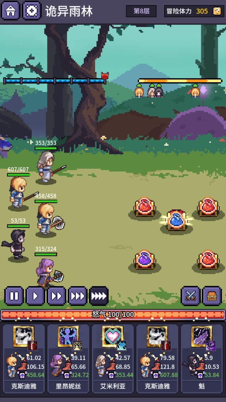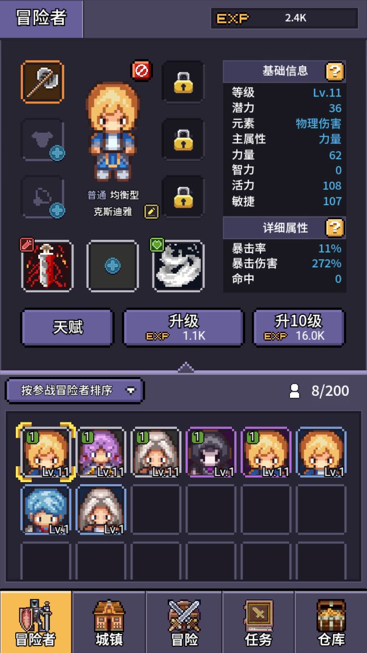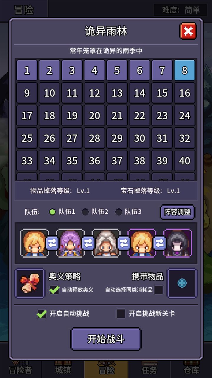开始组建你的冒险小队!每一位冒险者都是独一无二的,不同的冒险者拥有不同的技能,巧妙地组建你的配队,为冒险者们佩戴装备,使他们的战斗更加得心应手。