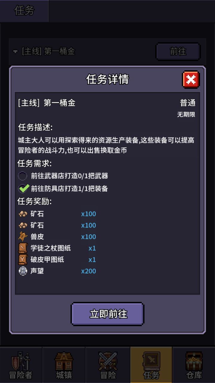 接取任务,开启你的冒险之旅。完成主线和支线任务不仅可以获得丰厚的物资奖励,也能提升城市的声望,随着迷雾镇等级的提升,可以接纳更多更强的来客,促进生产力的发展。