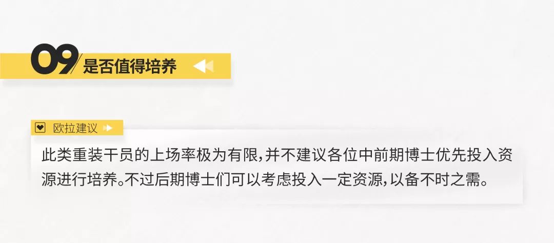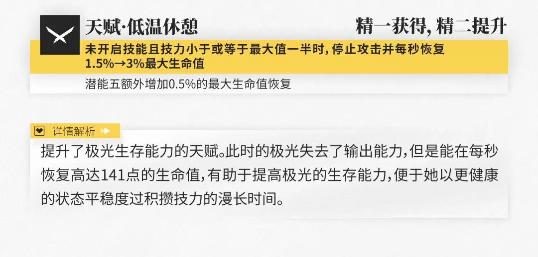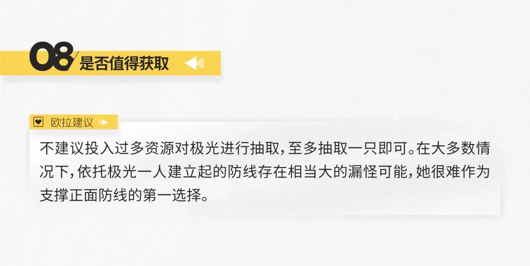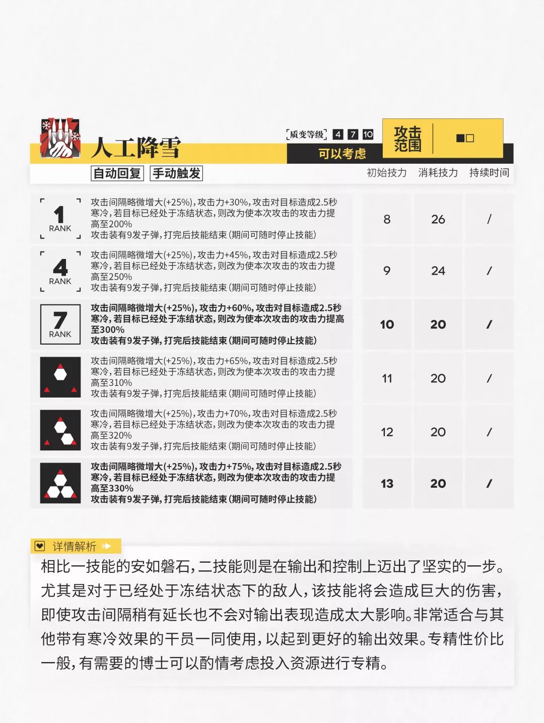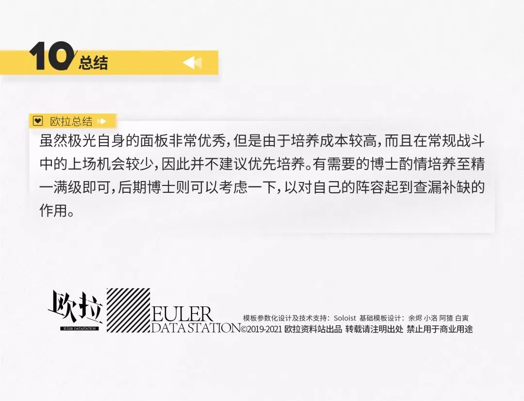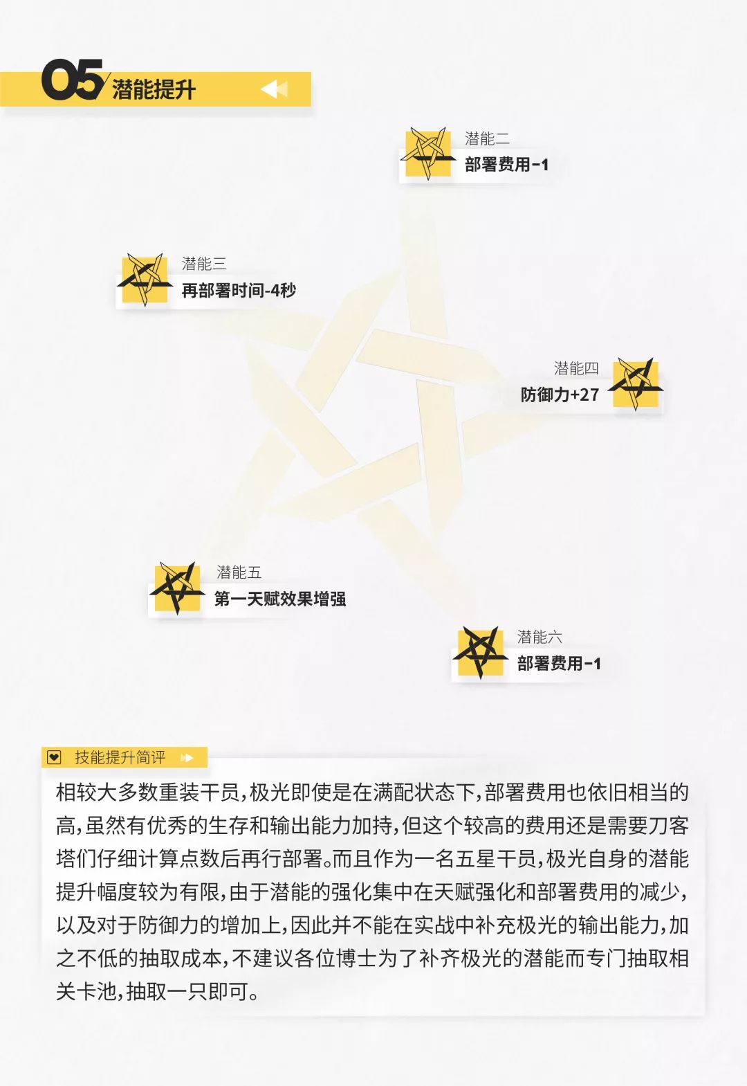 虽然由于面板数据上的差异,极光开启技能后的DPS没能追赶上森蚺,但是开启二技能的极光在攻击冻结状态的敌人时还是非常强悍的。希望各位博士合理搭配其他干员,让她的实力在战场中得到更为全面的展现。但碍于极光较高的培养成本,而且在常规战斗中上场的机会较为有限,因此并不建议各位博士优先投入资源对极光进行培养。