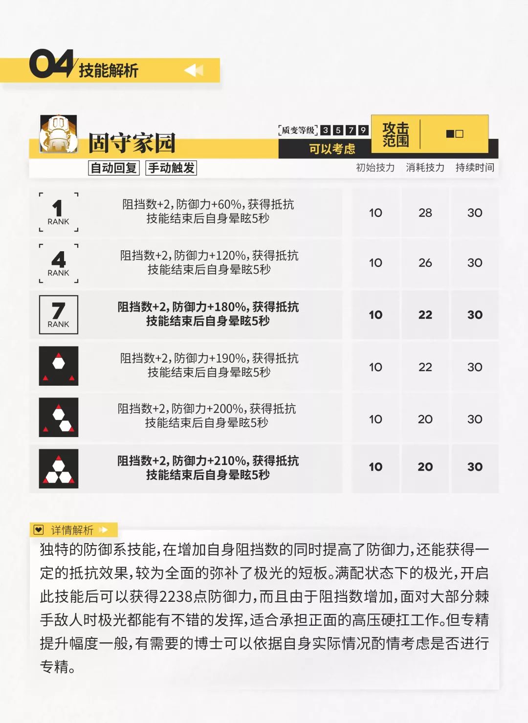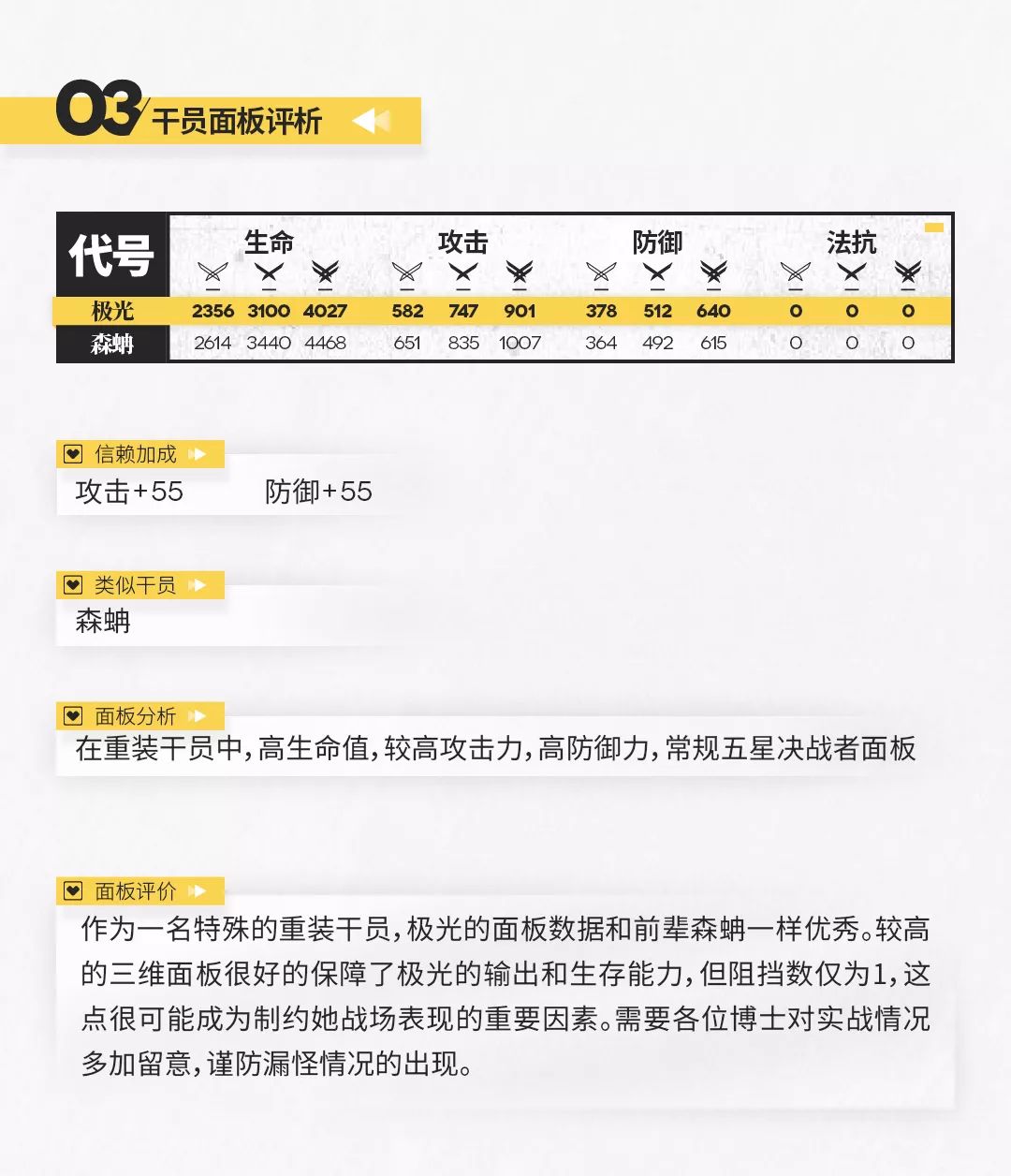 参考上图所示,极光的面板数据延续了决战者的一贯风格,较高的血量和攻击力赋予了她较强的生存和输出能力,防御力甚至超过了六星的同类干员森蚺,足见其攻守兼备的特性。这也为极光战场中的良好表现打下了坚实的基础。