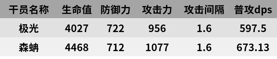 作为一名较为特殊的重装干员,极光的面板数据是她不可忽视的优势。但是在已经有同类六星干员森蚺“镇场”的情况下,极光究竟还有没有培养的必要性呢?下面就让我们用这个面板对比部分来说明一下吧。