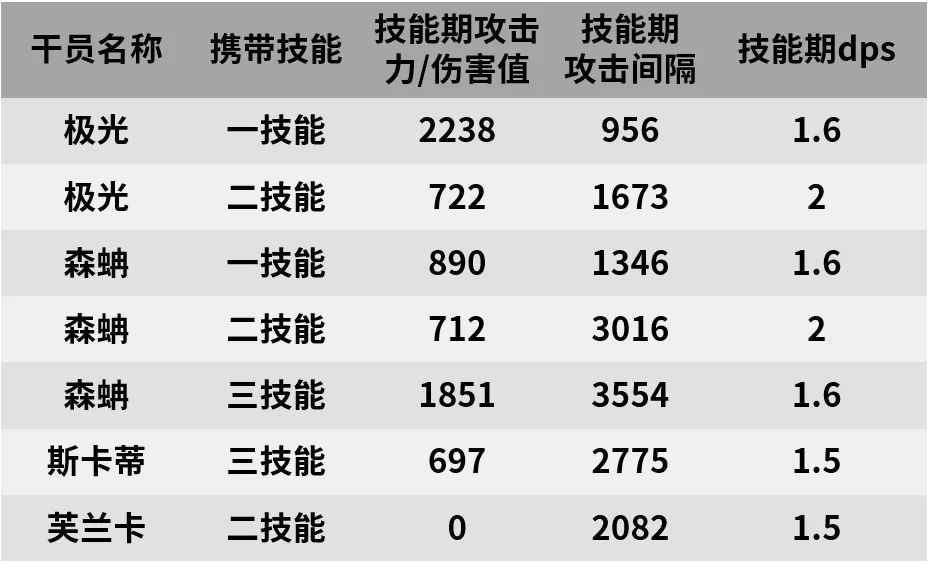 注:该模块的所有数值均为在干员精二满潜满级满专精的情况下计算。表格中所有数据所呈现的情况均为该干员的满配峰值情况,即满级、满潜、满信赖、满技能等级、满天赋加成。所有非100%概率触发的天赋不参与数值计算。所有光环类天赋仅对拥有该天赋的干员自身生效。