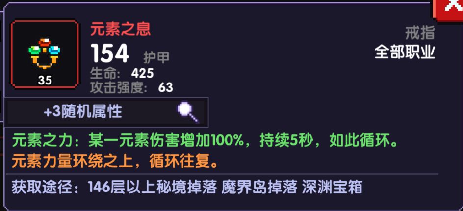 戒指依旧是选择元素戒,这个戒指能够让双系输出的两极藤吃到2种属性的100%元素伤害加成,所以是两极藤必选的一个装备,我个人并不推荐两极藤用赌狗,因为将来赌狗可能会改版,增加下限与上限,改动大概是每多一层赌狗层数就增加1%的消失概率,所以用元素是最好的选择