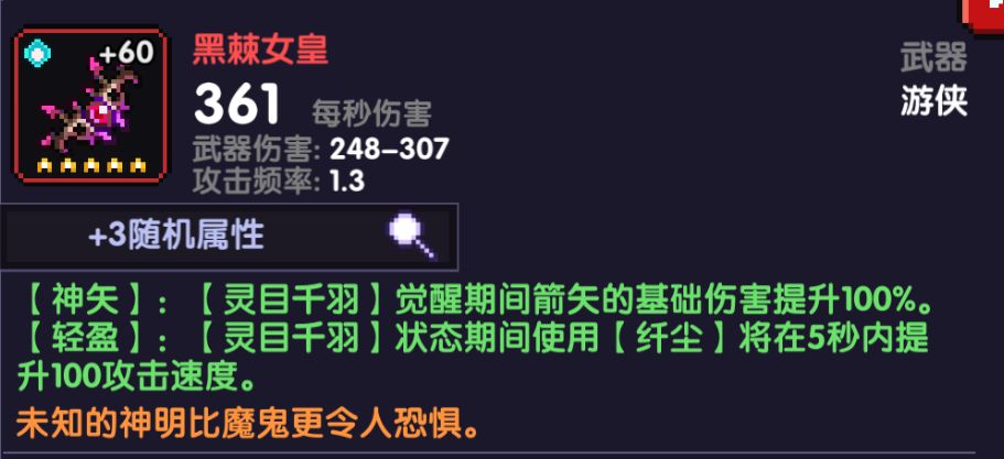 同样的疯藤乱舞能够提供充足的回蓝,所以搭配这个披风可以基本不断蓝,并且吃到25%的伤害加成,和游侠60级天赋一小段时间的CD与攻速增益