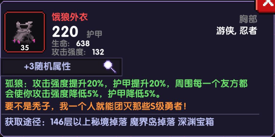 由于这个流派适用于推图类的单人玩法,所以饿狼是最好的选择,20%攻强20%护甲,能很大的提高伤害输出以及自身防御能力,需要组队的可以选择树叶外衣或者久战胸甲