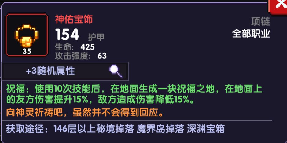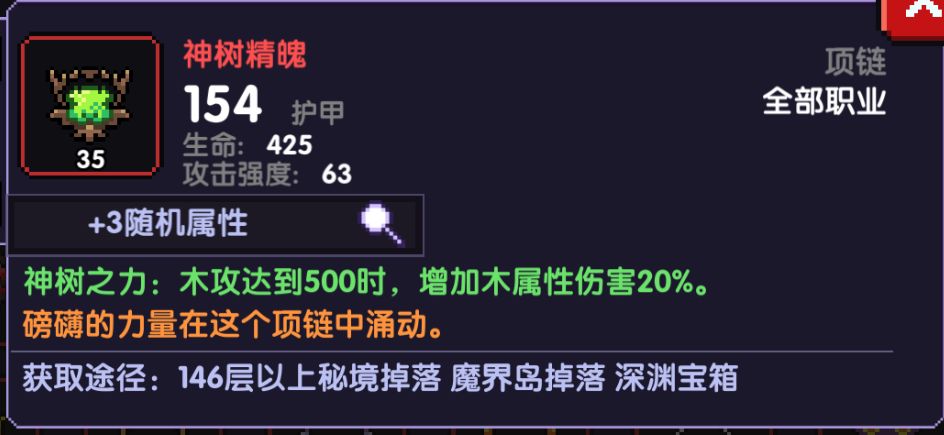 项链这边选择到了神树精魄以及神佑项链,如果要玩这个流派的话,我推荐刷一个绿孔的神佑,因为疯藤的高频率释放技能可以保持神佑15%增伤的持续性,而且15%增伤可以让两极藤的两种属性伤害都吃到加成,有神树的话,用神树也是很好的选择