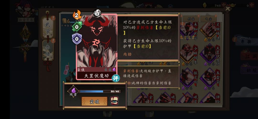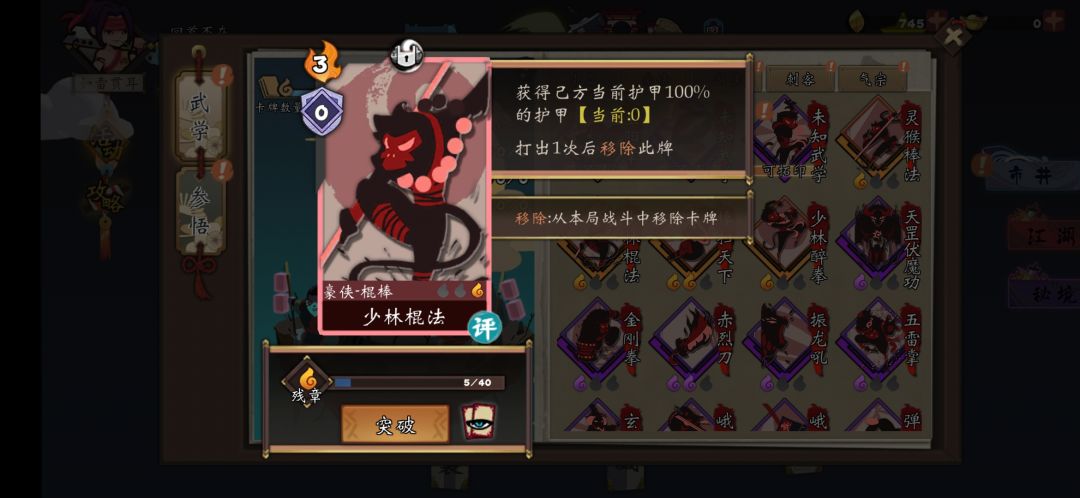 看了一恋大佬的攻略 自己瞎凑合玩 豪侠低配版 后面一回合干三个都可以 棒扫天下 三 四张 伏魔两 三张 少林棍法 两三张 玉箫有个贪狼还是啥的 减攻减防加100气血那个 中期补卡过度 防御卡先删 冲拳慢慢删 留一两张 补伤害用这样就是开局 伏魔加护甲 少林棍加护甲 棒扫打三倍护甲伤害 全部倒了下一局。