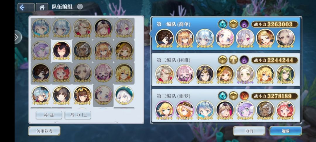 狂提了一波练度可算给他打过了。更新之后的海域新层主要强在了敌方的坦度(毕竟输出都是秒也没啥好提升了),我的装备练度不够,只能动用所有角色资源来打了。整体思路和上一篇帖子相近,这回主要补充一些细节上的东西,主要是因为我个人根据自己角色情况进行的配队调整,不适用于所有人但是想法是可以借鉴的。还是那句话,大家的角色储备和练度都层次不齐,打海域需要的是一个综合的box练度(除了阿达拉)以及合理的战力分配,可能你这个角色没有就可以用别的角色或者是一些手操来应对,这个角色装备不行但是又很差锤子就从别的队伍分装备或者分辅助过来,毕竟每层不超时就是胜利。