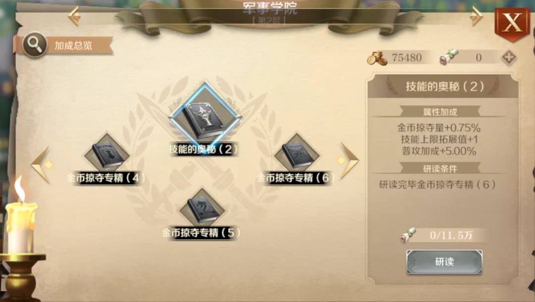 因为技能升级是消耗金币的,所以技能强化冲榜主要比的是各位领主大大的金币获取量,将会统计18个技能消耗的金币。建议大家可以选择把军事学院升级到2级,这样英雄20级的时候可以升级自带技能(如:关帝圣君)到12级,解锁第三个技能槽。英雄所带技能尽量选择S级技能,因为S级技能升级消耗的金币比A级技能消耗的多。