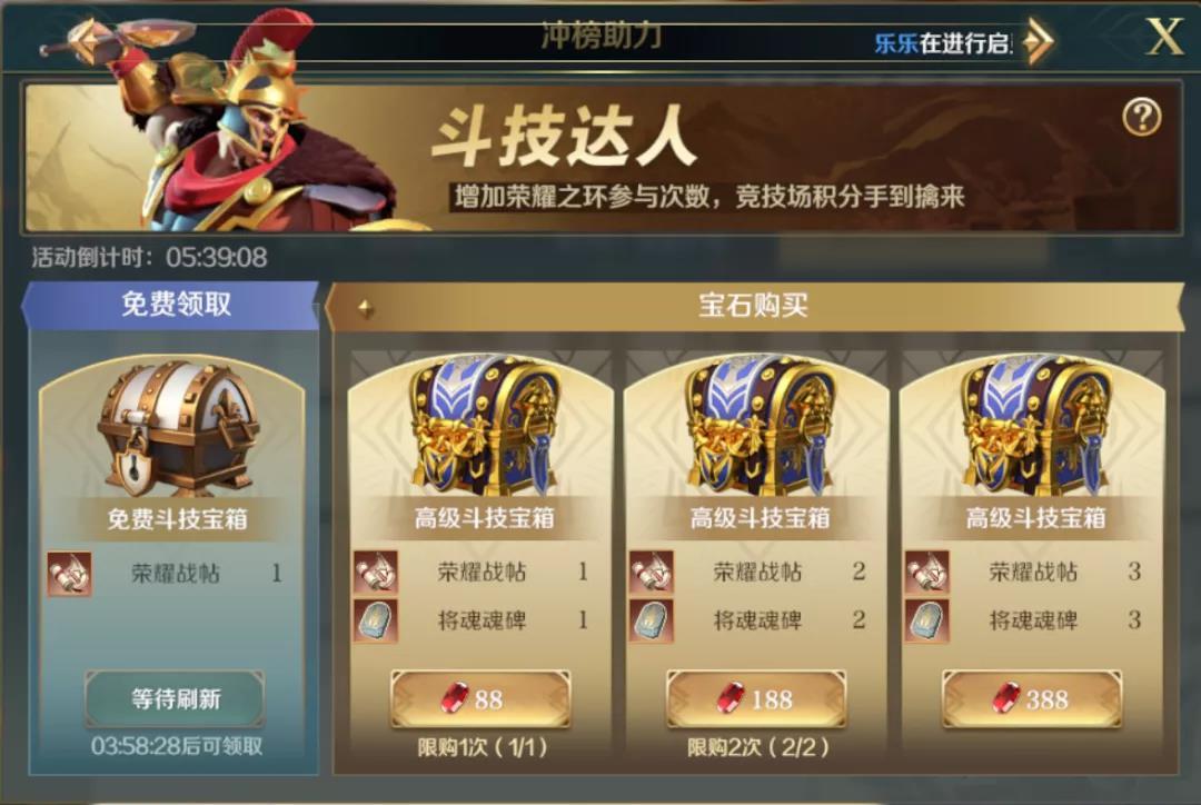 斗技达人的冲榜也是考验大家的队伍强度,队伍强度越高竞技协会的排名就越高。冲榜助力里面可以提供额外的竞技次数,有免费获得的也有消耗宝石购买的,大家可以每隔4小时免费领取一次。