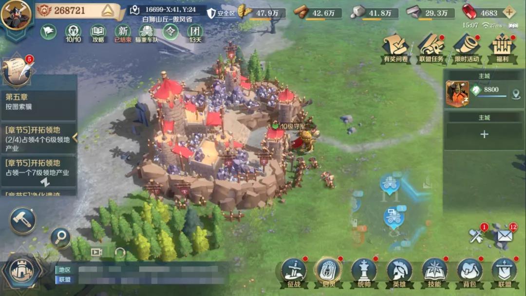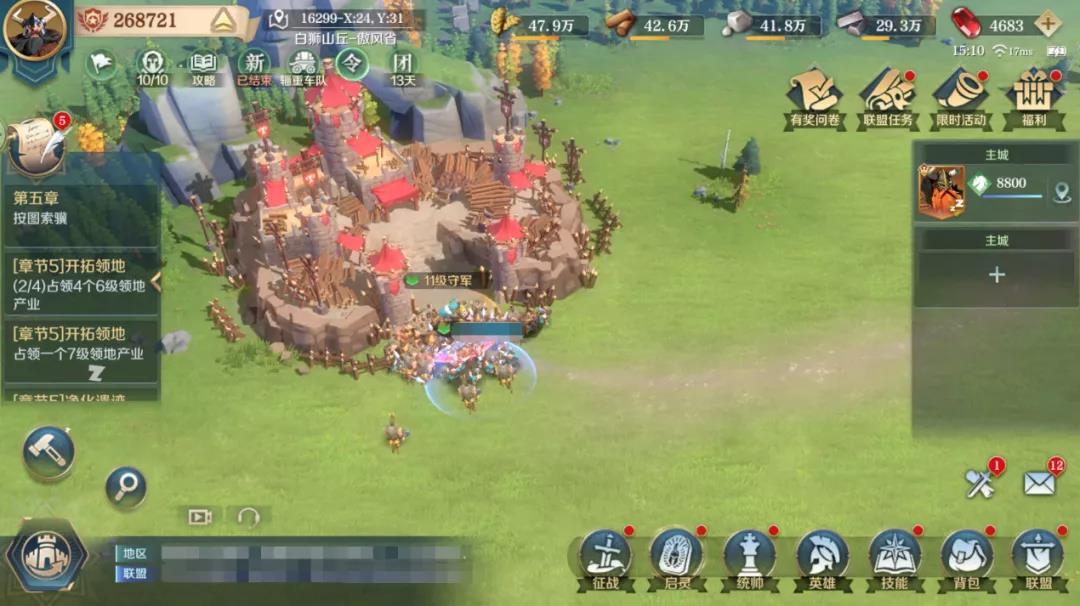 第五天,除了照常完成主线任务、攻打世界资源地等外,还要继续对11级城市以及13级城市进行铺路,根据就近原则,选择离自己最近的城市进行规划路线。同时动员联盟的其他成员一起铺路,这样才能够比别的联盟更一步到达13级城市周边,同时还能有空余时间去攻打黑鸦机构来提升联盟的王权值。