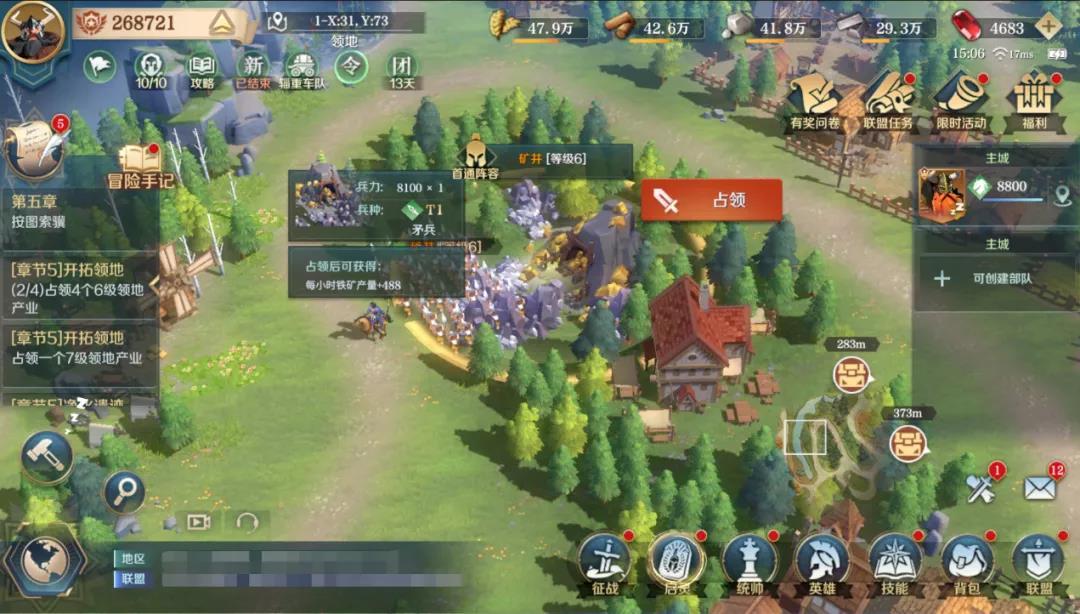 同时市政中心能够升级到15级左右,到了晚上会解锁完T2兵种,能够开始挑战11级、12级产业地和世界资源地,大大提升队伍的强度。