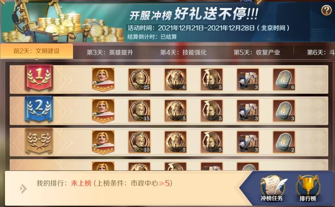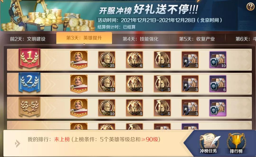 第二天英雄提升的榜单需要统计5个英雄的等级总和,从第二天开始练级的领主们在第三天开始会有明显的等级差距。
