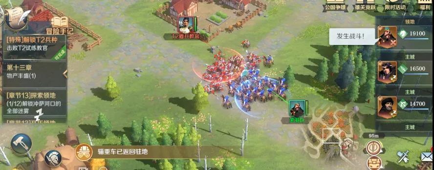 在第二章的时候,会出现一个击败6个4级叛军的任务,在领地中只能驱逐3个叛军,其余的叛军需要领主大大到主城外驱逐剩下的3个叛军才能够完成任务。在收复4级产业地时,通过建立城堡来提升队伍的兵力上限,推荐队伍平均等级13~14级,兵力在3000左右,并且最好部队的兵种选择克制产业地的兵种。