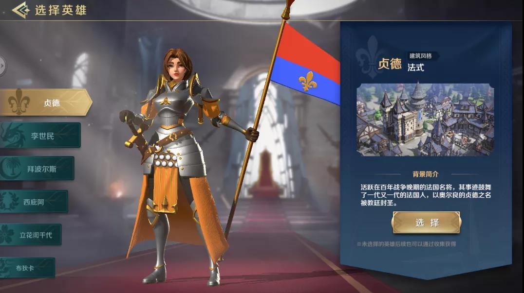 开局一共有六个文明供大家选择,前期比较推荐大家使用华夏文明的李世民、法国文明的贞德以及不列颠文明的布狄卡。李世民和布狄卡在前期带有比较强力的控制,在后期也具有一定的强度。