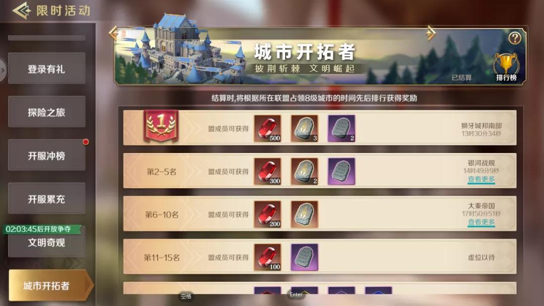 在第四天的时候会开启城市开拓者这个活动,活动主要是按照联盟的攻城速度来排名结算的。所以盟主和官员在第四天八点的时候就需要及时动员联盟成员占领区块进行铺路,在铺路到了八级城市之后,就可以发起宣战开始攻城了。