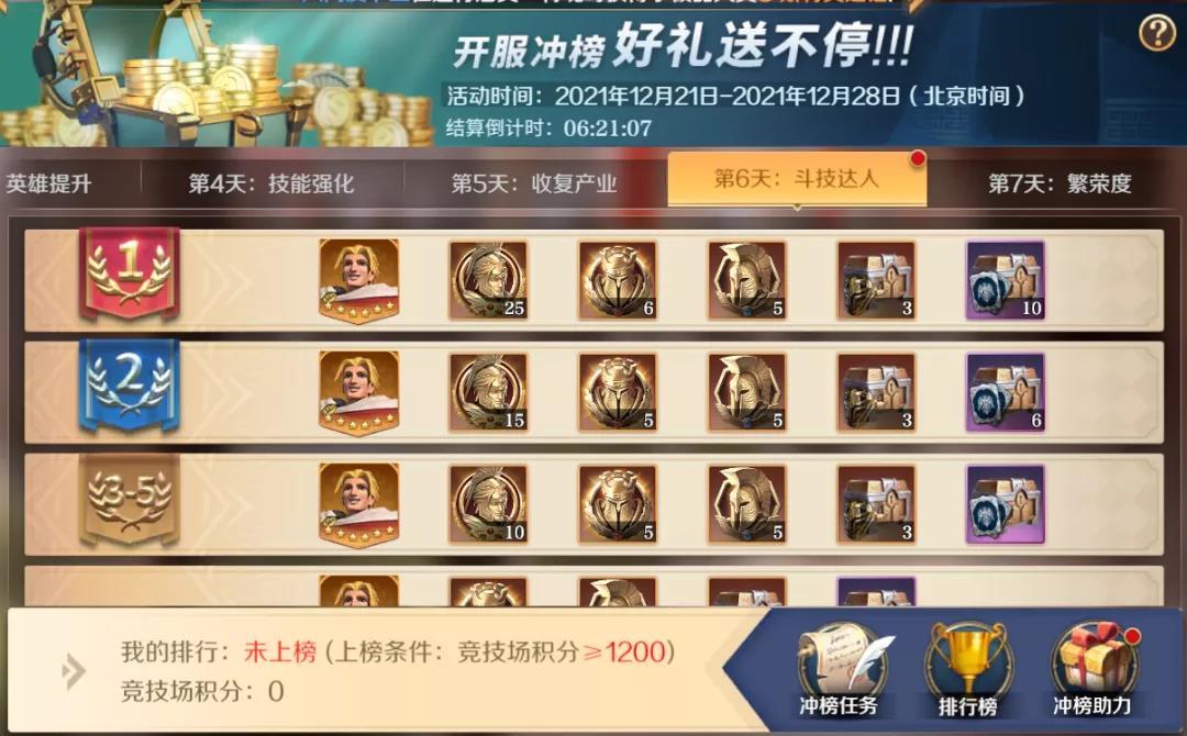 开服的冲榜活动是一个很大的福利,大家都有机会可以荣登榜单。开服冲榜分为7天,每个榜单的结算奖励都一样,榜单排名前10可以领取通过各类限时活动才能获取的限定英雄【觉醒】亚历山大