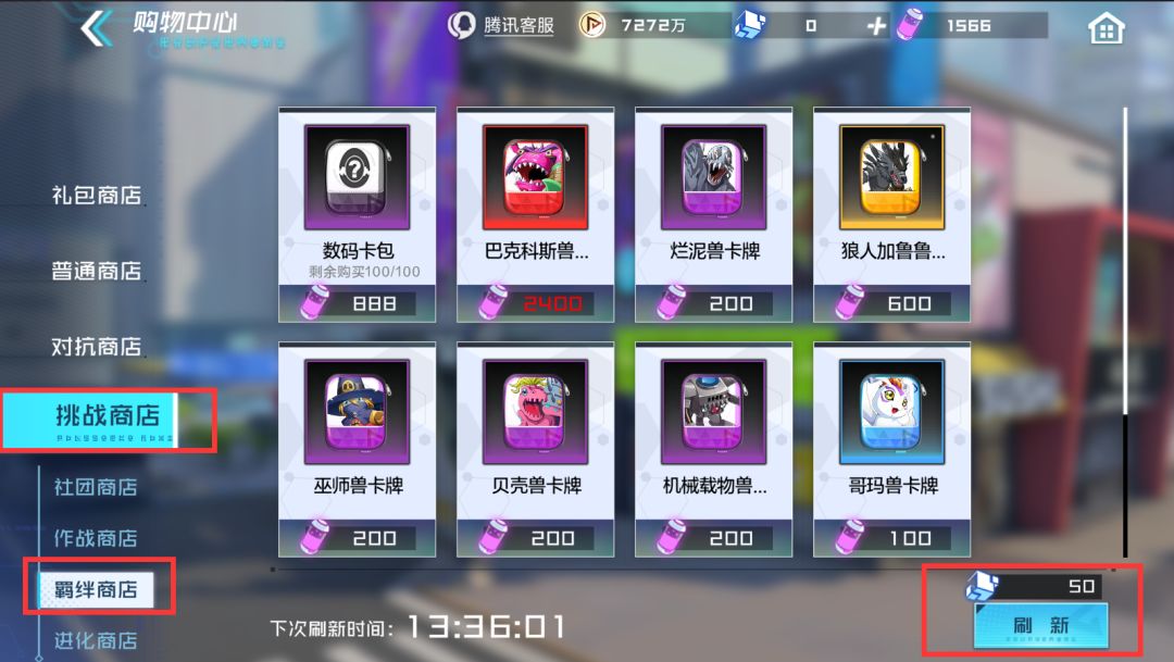 中期:对战力提升需求大,可选择每日50晶砖/次刷新50次羁绊商店购买需求数码羁绊卡