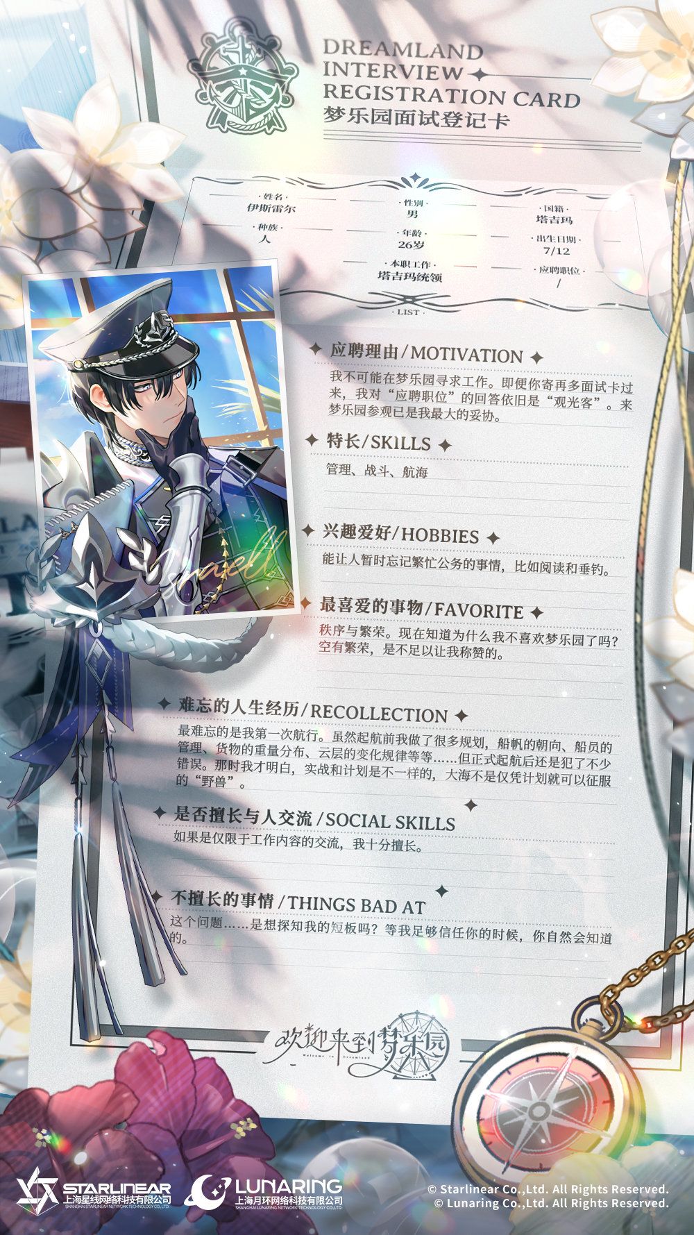 作为一名雷厉风行的执行者,伊斯雷尔其人不苟言笑,曾经是海上令人闻风丧胆的海军统领,但因为平日太过于严厉,性格也过于刻板强硬,所以没有朋友。不过据本人称,他并不在意。