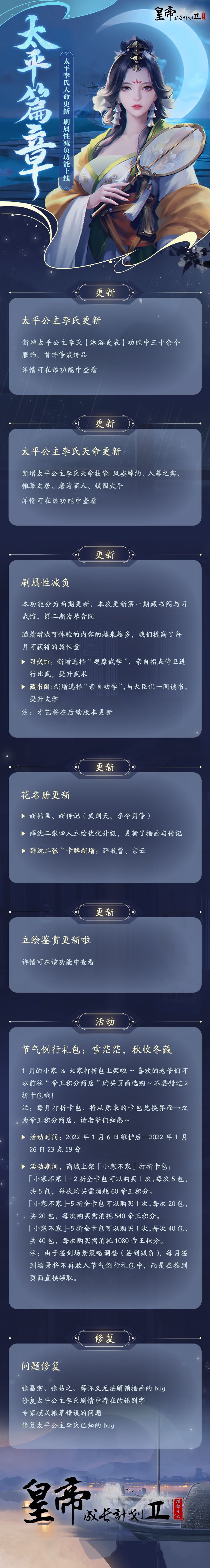 《皇帝成长计划2》于1月6日早上07:00-10:00进行本周的更新维护,具体内容公告如下(如有变动,一切以游戏内正式公告为准):