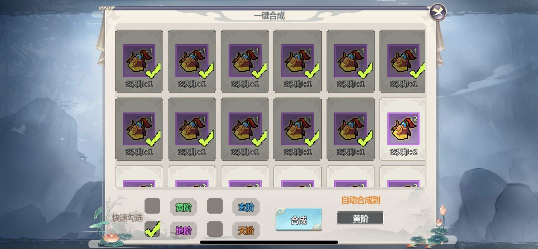 1.可以勾选一键合成的法宝,如果没有低于设定品质可进行合成的法宝(低于2个)则不能进行一键合成