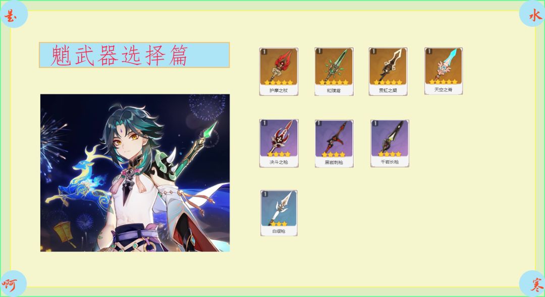 白缨枪属于是难民武器中的宝了,但被动的普攻伤害加成与魈不搭,不然期望伤害还能抬上不少。不建议抽了魈还用白缨枪哈!魈作为璃月的护法夜叉,少说也得配上一把黑岩刺枪吧!