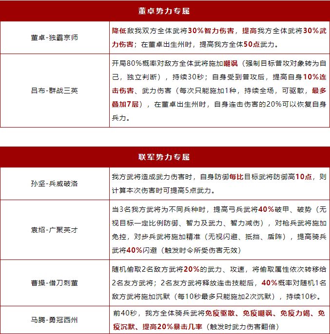 开放【事迹】的专属武将通常与剧本内容有关,《群雄讨董》剧本中将根据主公选择的阵营会开放对应的事迹购买,同种事迹最多购买一次: