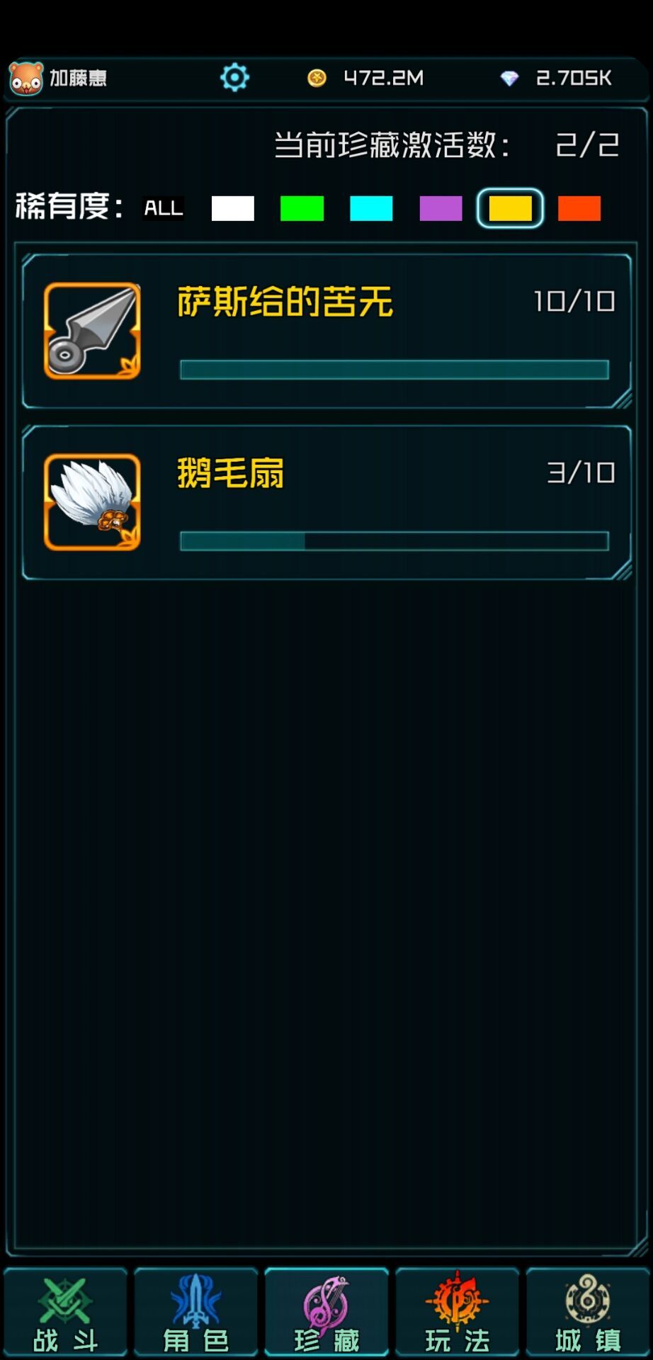 具体情况,珍藏苦无满级,鹅毛扇3级,红珍藏都是6级,副武器42级,觉醒1012(白猫511黑猫501没打了)