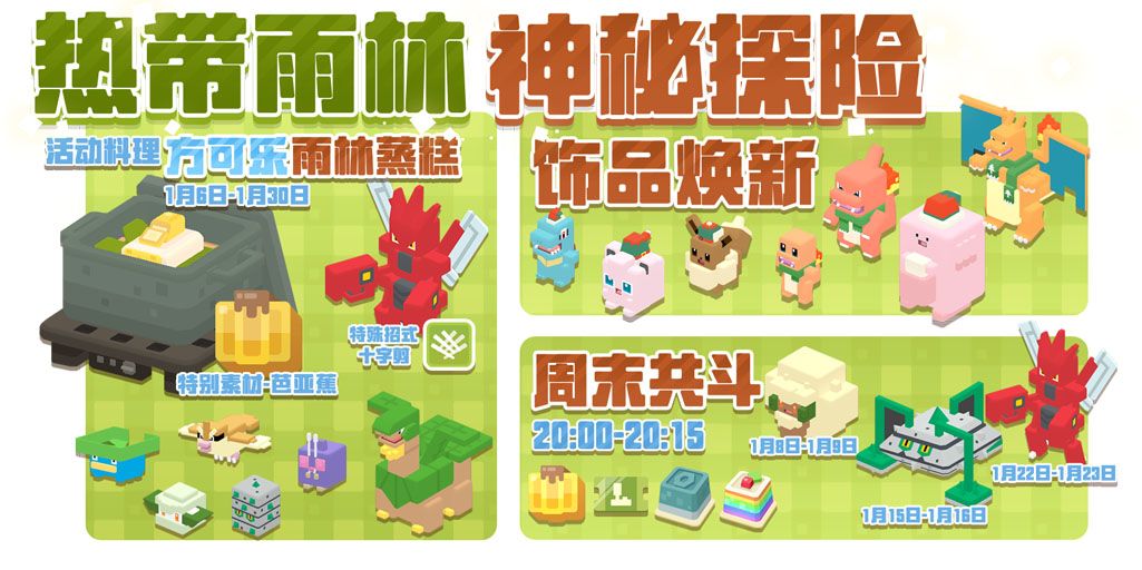 元旦版本惊喜降落,全新探索热带雨林!由网易、The Pokémon Company、GAME FREAK inc.携手开发的《宝可梦大探险》元旦版本全新活动火热进行中,风情特异的自然风光,不同的雨林生物,创意与美味兼具的特色食谱,海量内容放送中,诚邀各位探险家一起探险!