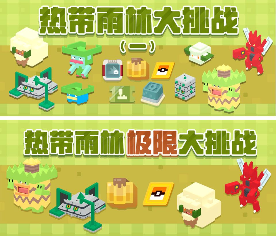 图2:热带雨林的元旦派对 同时,探险家们还将迎来“热带雨林大挑战”与“热带雨林极限大挑战”,与各种野生宝可梦展开对抗,获胜后可以获得珍贵的食材芭亚蕉、招式学习器·陀螺球、兑换券、友好商店礼券、锵锵松糕等丰富奖励。宝可梦的属性、招式差异既是挑战也是乐趣,请尽情在实战中提升你的小队实力吧。