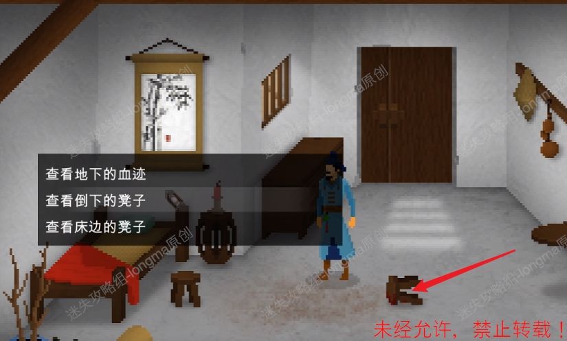 50.查看地上的凳子,依次选择“查看地下的血迹”“查看倒下的凳子”“查看床边的凳子”得到【碎木块】,总结线索。50