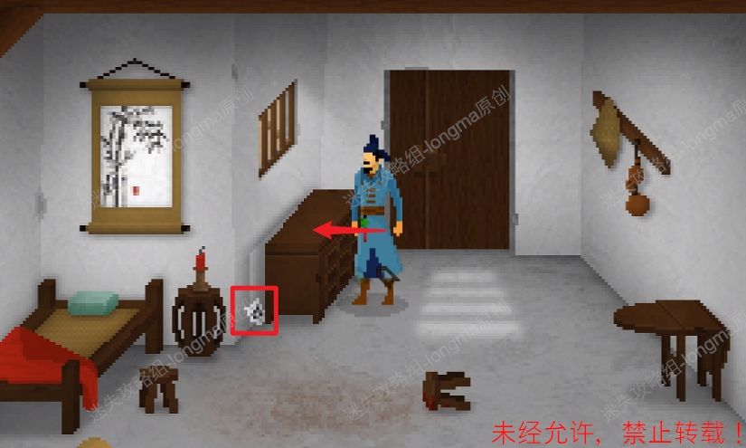 54.调查门口左边墙壁上的印记,挪动旁边的柜子得到【字条】。54 54.1