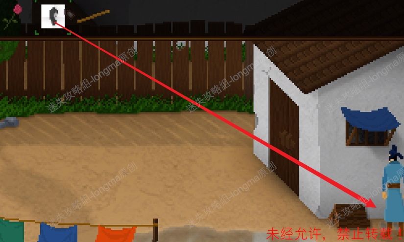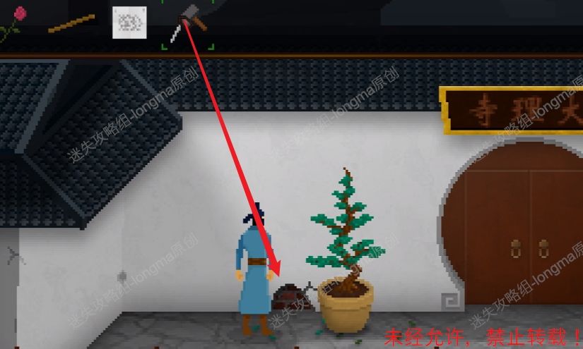 59.来到大理寺门口,左边花盆上停了只蓝鸟,蓝鸟飞走后,移动花盆,漏出后面被破坏的墙角。59