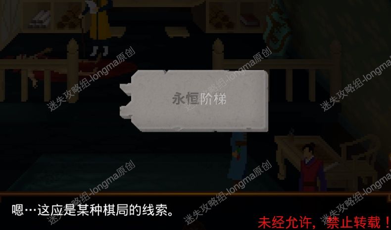 74.来到宅邸,查看【石质钥匙】,黑色字为永恒,白色字为阶梯,来到右边书架旁,拾取右边中间的竹简,得到【对弈入门】。74 74.1