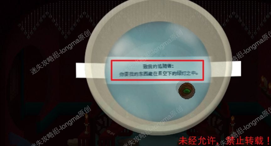 95.来到宴会厅的阳台,查看中间的绿光灯笼,得到第三张【纸条】。95
