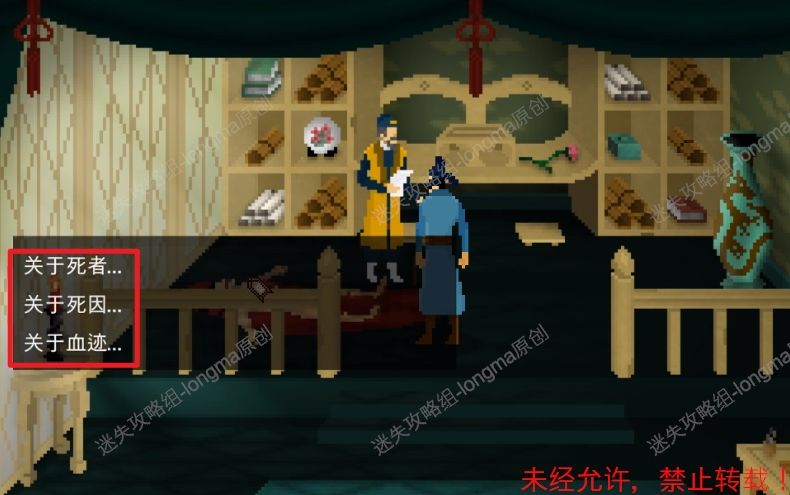 68.和仵作对话,选择“关于死者...”“关于死因...”“关于血迹...”。68