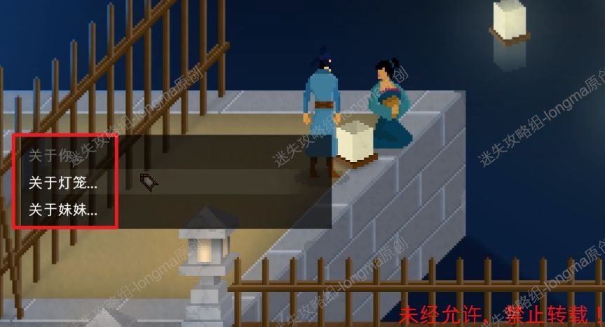 81.来到上面女子旁边,与之交谈,依次选择“关于你...”“关于灯笼...”“关于妹妹...”“关于书信...”得到【毛薇的信】。81 81.1