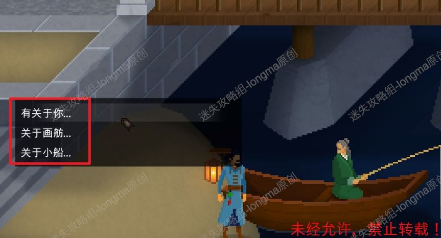 80.询问老者,依次选择“有关于你...”“关于画舫...”“关于小船...”“老先生可信鬼神?”80
