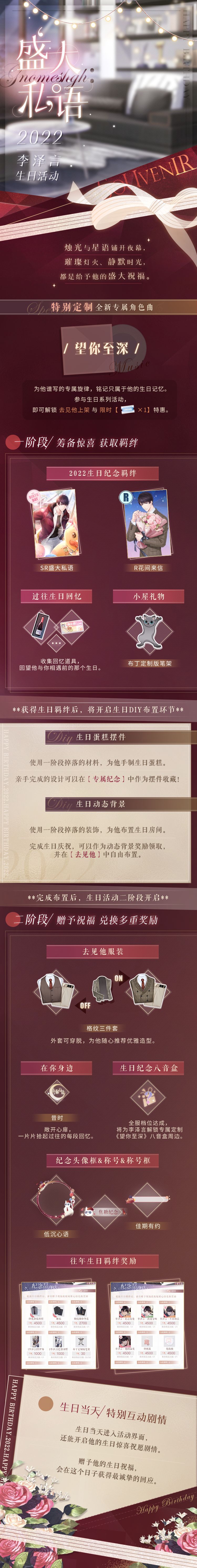 生日当天——特别庆生剧情 1月13日0:00 ~1月14日23:59进入活动界面 ,即可触发他的特别庆生互动剧情。