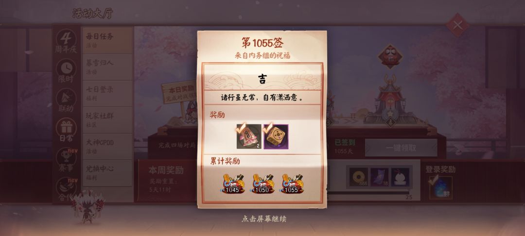 这一次回游,或许是在19年4月份吧,打开了一般只有有问题时才用的tap,点开了决战平安京论坛,想找找有没有和我一样倒霉的人,那时候的论坛,真的很活跃呢,大家都很好,但是始终没有能把大家连在一块的群。我就自发主张的建了个群,从一开始的只有仅仅一两个,再到现在快有百来个人,不少熟人都被我捡回来惹。当然也认识了对我很重要的一些朋友们啦,也更加喜欢上了tap这个社区。不知不觉得,已经签到1000多天了。