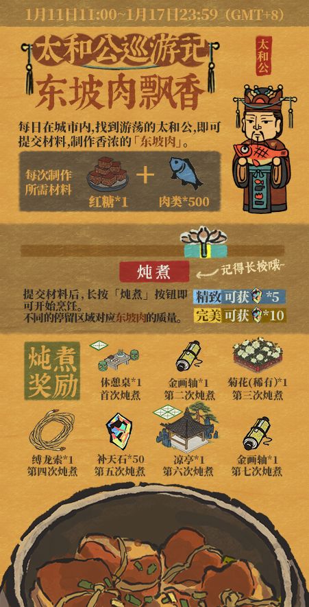 在城中找到太和公,提交食材烹饪东坡肉即可领取金画轴、补天石等丰富奖励。
