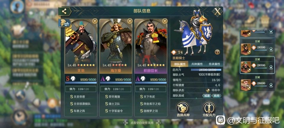 2、搭配思路: 首先是织田的阿金库尔之焰发动然后联动织田的被动技能达到敌方全体被施加灼烧,接着海尔曼的嘲讽破甲1~3人,瑞士卫队弥补海尔曼没嘲讽到的人,并使其受到的伤害增加,十字军提高友军的伤害。最后就是关羽的输出,在灼烧效果下关羽的自带技能有25%的概率再发动一次,配合其他两人的破甲,和灼烧打出高额的伤害,车悬之阵为关羽免控,而且还有高额的单体伤害,北非掠袭舰队如果脸好的话,就可以实现爆头的效果。总体来说这套阵容就是关羽的群伤(2人),配合织田全体施加灼烧(提高关羽技能的发动率),提高打到敌方破甲的武将的概率(因为海尔曼是嘲讽1~3人,然后很多武将都是单体伤害,这样海尔曼的破甲效果就大打折扣了),再加海尔曼技能的增伤效果,把伤害达到最大化。
