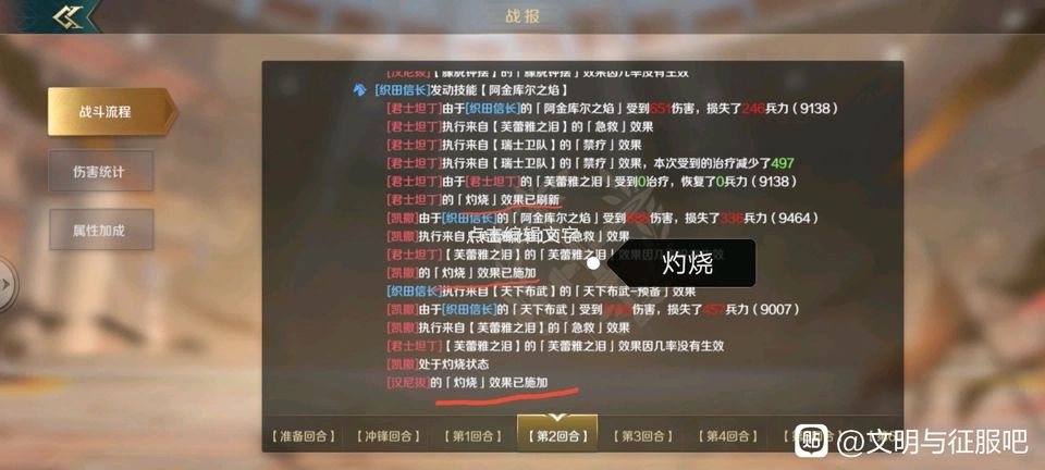 四、后面是灼烧,破甲,关羽技能发动的效果图。战报图的话,我玩的区基本不怎么活跃了,勉强拿一个,都是在遗迹好不容易找到的,而且我织田没觉醒,不过这样也可以的。后续有的话,会在评论区补上。