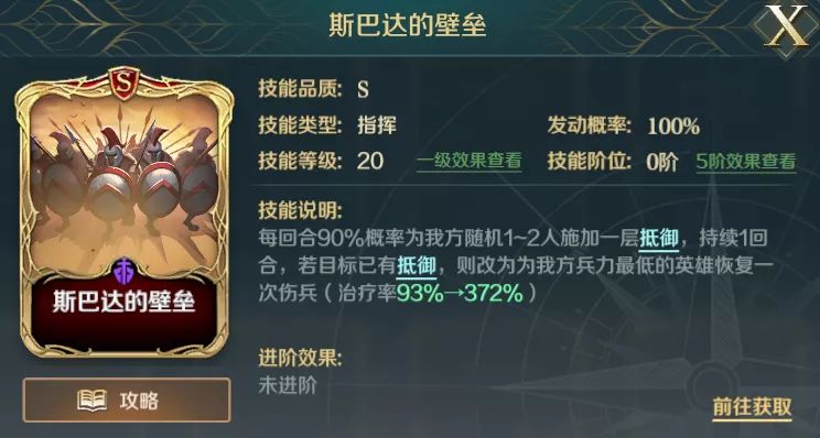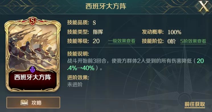 1)西班牙大方阵也可用斯巴达的壁垒替换,斯巴达的壁垒拥有整场战斗施加抵御的效果,对于有点脆的队伍也是很好的选择