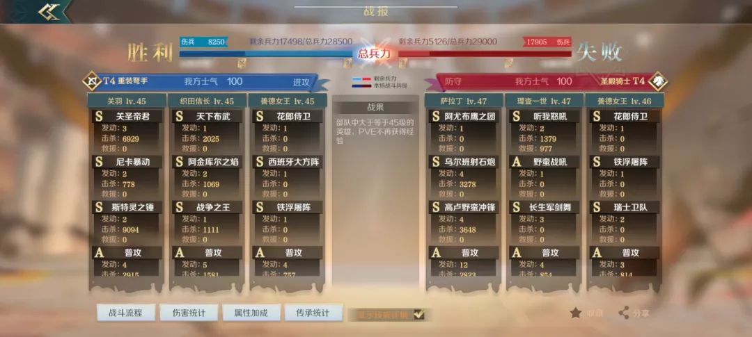 但是缺点就是太脆皮了,所以善德女王的作用就出来了,全场战斗提供被受伤害降低8%,还能免疫一次控制(使队伍有一个好的输出环境),且发动主动技能也会提供被受伤害降低16%的效果,搭配西班牙大方阵【前三回合,提供的被受伤害降低40%(满级)】和铁浮屠阵(提高队伍主动技能的发动率)就可以弥补队伍脆皮的缺点了。