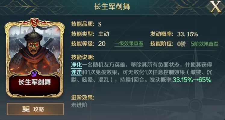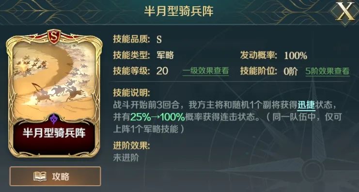 2)半月型骑兵阵可用十字军谕令替代,半月型骑兵阵算是辅助爆头队爆发比较需要的技能吧,如果没有的话,就只能求其次,用十字军谕令,为随机队伍两人提供25%的增伤。
