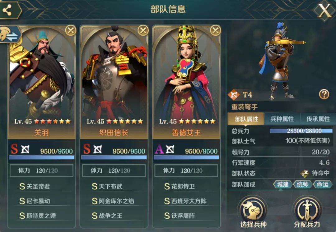 而且善德女王不吃属性的加成和技能联动,在技能搭配上,可以搭配很多增益技能,比如铁浮屠阵,半月型骑兵阵等等。